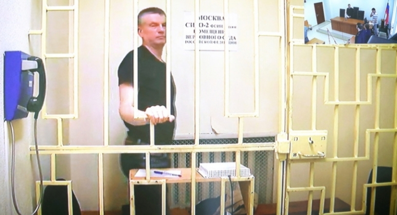 На фото: начальник главного управления кадров Минобороны РФ генерал-лейтенант Юрий Кузнецов (на экране) в режиме трансляции по видеосвязи из СИЗО. (Фото: Максим Григорьев/ТАСС)
